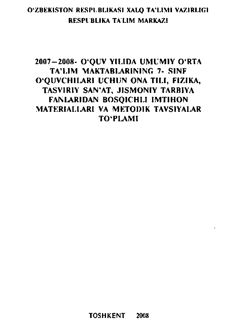 Read More 2007-2008-o`quv yilida umumiy o`rta ta`lim maktablarining 7-sinf o`quvchilari uchun ona tili, fizika, tasviriy san`at, jismoniy tarbiya fanlaridan bosqichli imtihon materiallari va metodik to`plami